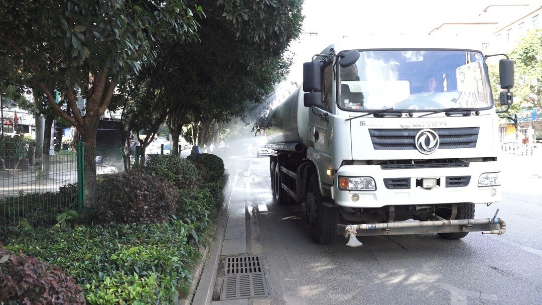 临近傍晚,在县城芙蓉东路、迎宾路、欧阳海大道等多条干道沿线,园林工人们有的喷洒杀虫剂,有的修剪枝叶,有的浇灌树木和花草,一派忙碌的景象。根据天气变化,工人们适时调整浇水时间和频率,重点加强早晚间浇水力度,避开日间高温时段,减少水分蒸发,通过人工清理与药物防治和机械设备相结合等方式,确保浇灌全覆盖,为苗木“解渴”。