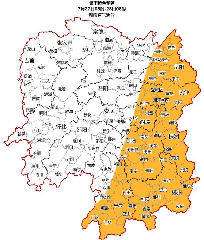 湖南省气象台7月27日6时发布暴雨橙色预警:预计27日8时至28日8时,长沙、株洲、湘潭、衡阳、岳阳、郴州、永州部分地区将出现暴雨,局地大暴雨,并伴有短时强降水、雷雨大风等强对流天气,请加强防范。
