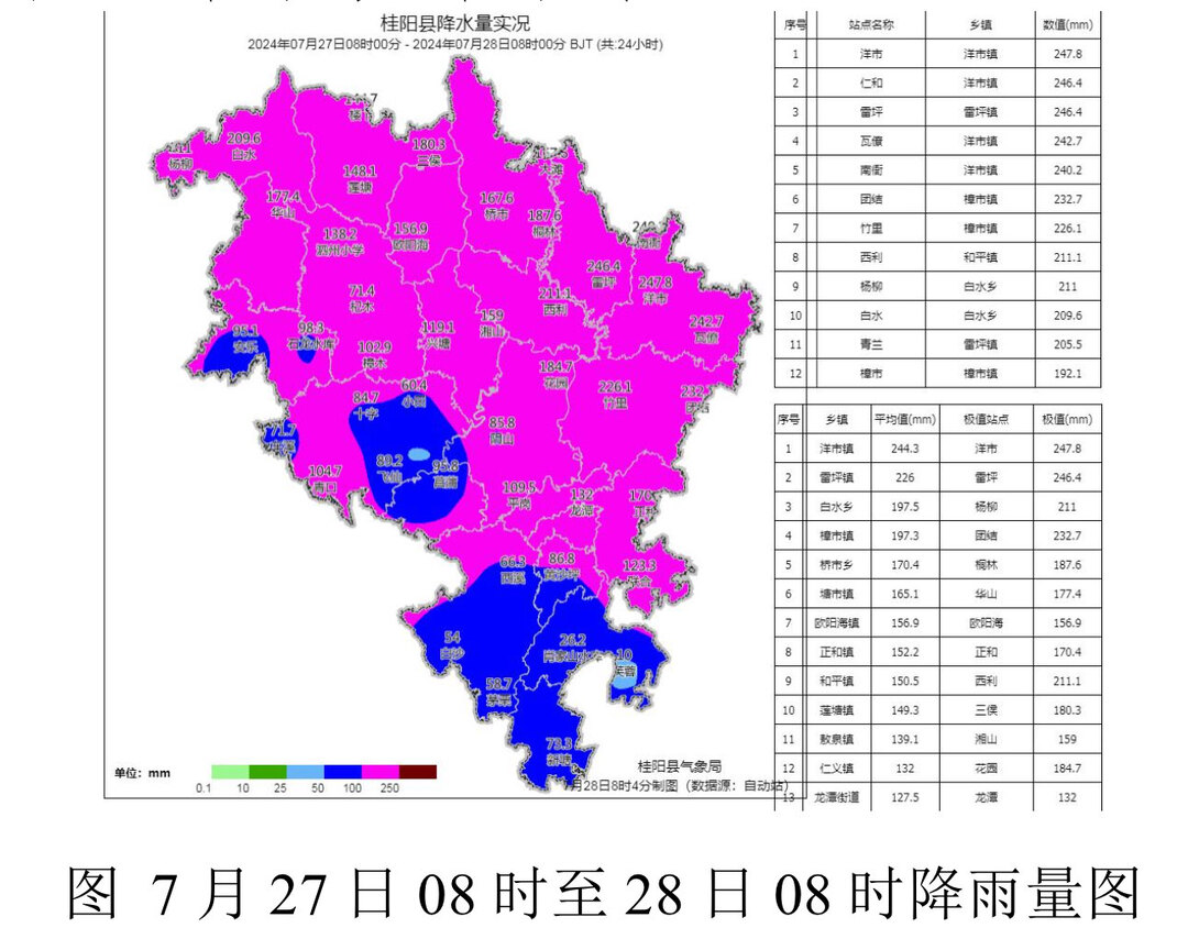 27 日 08 时至 28 日 08 时全县平均降雨量为 135.4 毫米,共出现 50 至 99.9 毫米 18 站(6 乡镇),100 至 249.9 毫米 42 站(16 乡镇), 最大降水 247.8 毫米(洋市镇洋市站)。