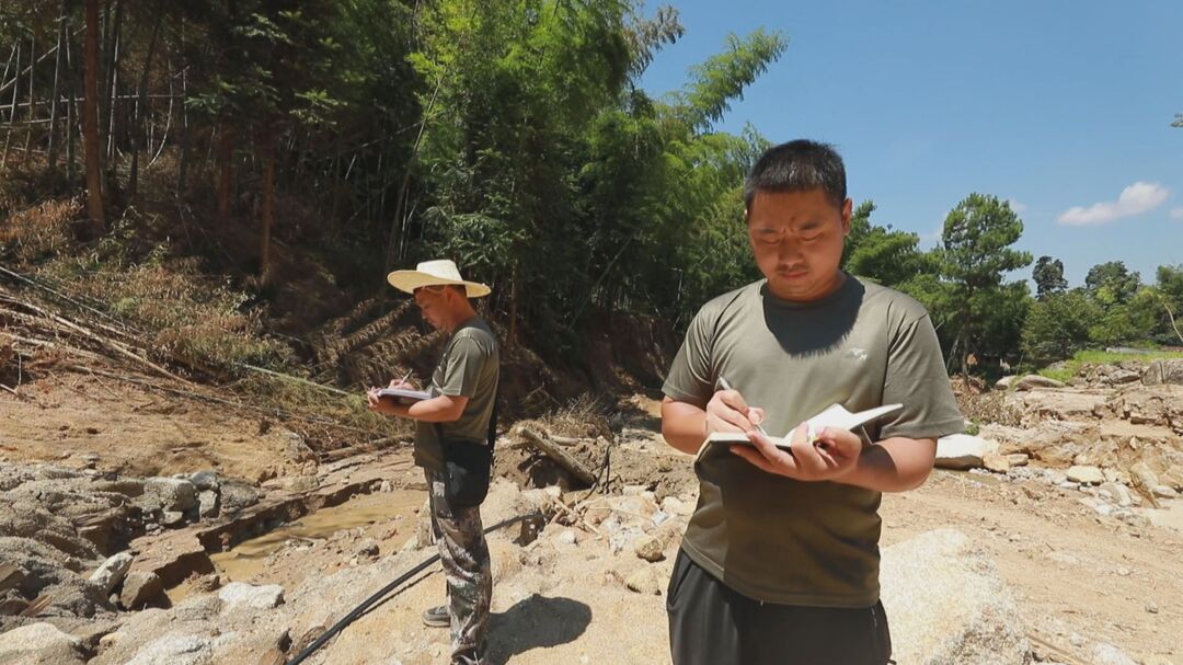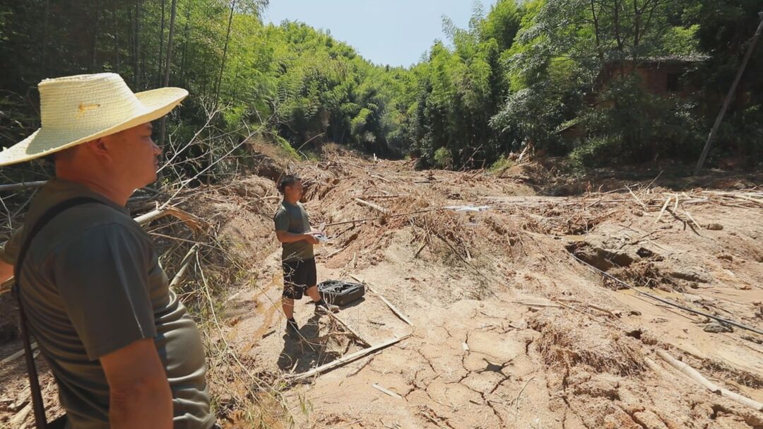 一大早,帮扶行动队地质灾害隐患排查小组的成员们来到资兴市桎木村进行现场勘测摸排。通过随身携带的无人机,从高空勘测受灾情况,记录泥石流沟域形成区、流通区和堆积区的范围和特性等数据。他们用多年积攒的专业知识分析着受灾情况并详细写下下一步需要采取的合理措施。