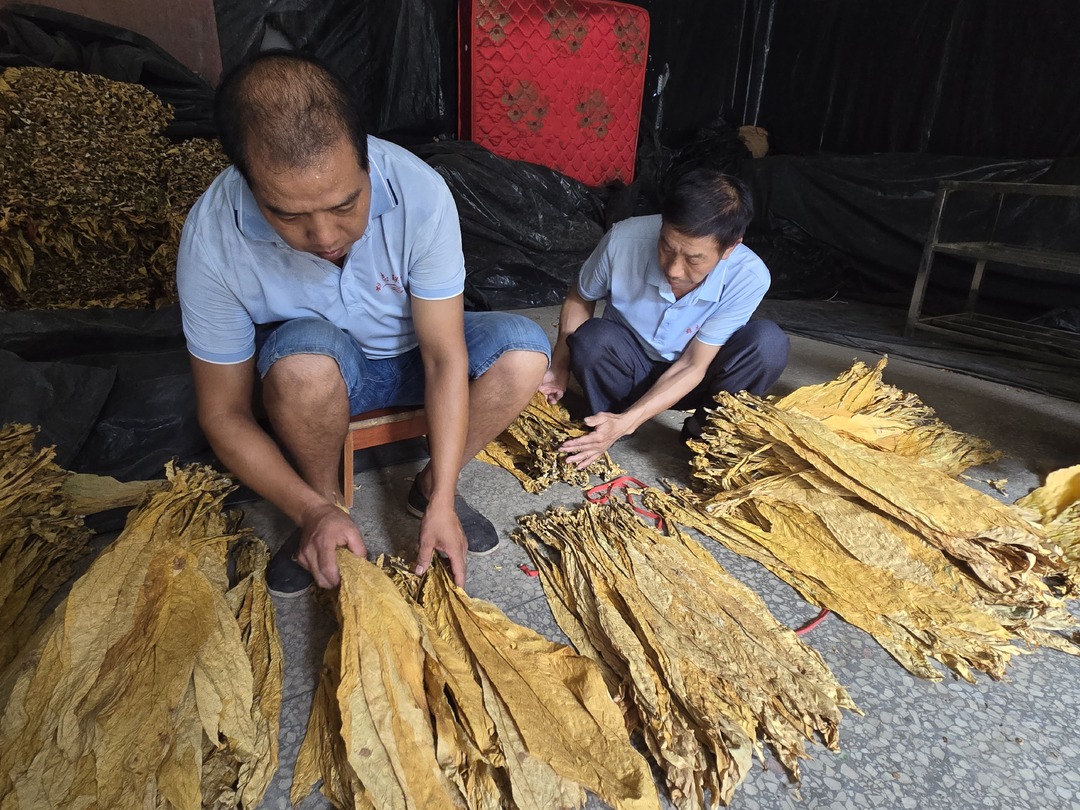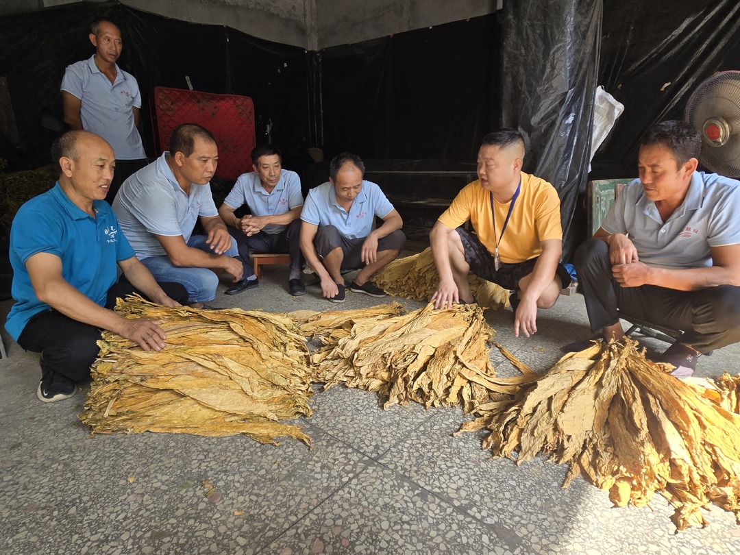 在樟市镇,烟叶评级工作正有序开展,烟农们聚在一起,在技术员的指导下对自己的烟叶进行初步分级。技术员犹如老道的中医拿起烟叶仔细端详,初步观察烟叶颜色、部位、茎叶比例,之后再根据触感区分烟叶的油润、厚度,多方面进行评估分级。