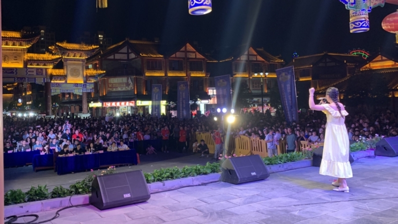 在文化园古郡城的戏台前,人头攒动,热闹非凡,首场选拔赛在此激情开唱。参赛选手依次登台亮相,通俗、流行、民族、嘻哈等多种唱法轮番唱响,他们用精湛的技艺演绎着一首首脍炙人口的美妙歌曲,超燃的音乐氛围让夜色多了一份激情,不时迎来观众阵阵掌声。