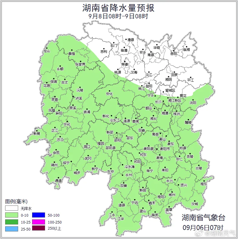 9月8日白天到晚上,湘北多云间晴天,其他地区多云有阵雨或雷阵雨;北风2~3级,雷雨时局地阵风7~9级;最高气温湘东35~37℃,其他地区32~34℃;最低气温湘东24~26℃,其他地区22~24℃。
