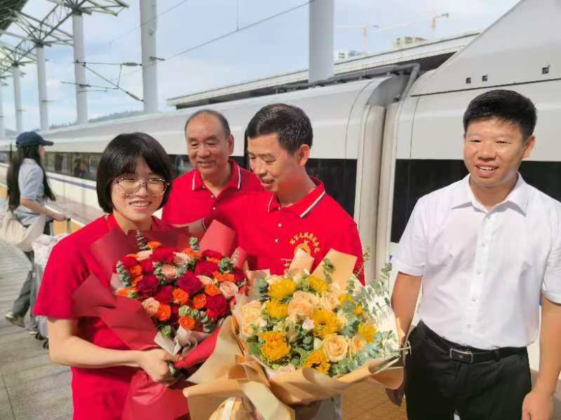 “欢迎欢迎!热烈欢迎!欢迎史逸婷载誉回乡!”下午三点,史逸婷的爸爸、启蒙教练及亲友团们早早来到了车站等候,大家手捧鲜花,举着手牌,展开横幅,欢迎冠军载誉回乡。当史逸婷的身影出现在高铁车厢门口时,史逸婷的爸爸给女儿送上鲜花,祝贺她在巴黎残奥会实现梦想。