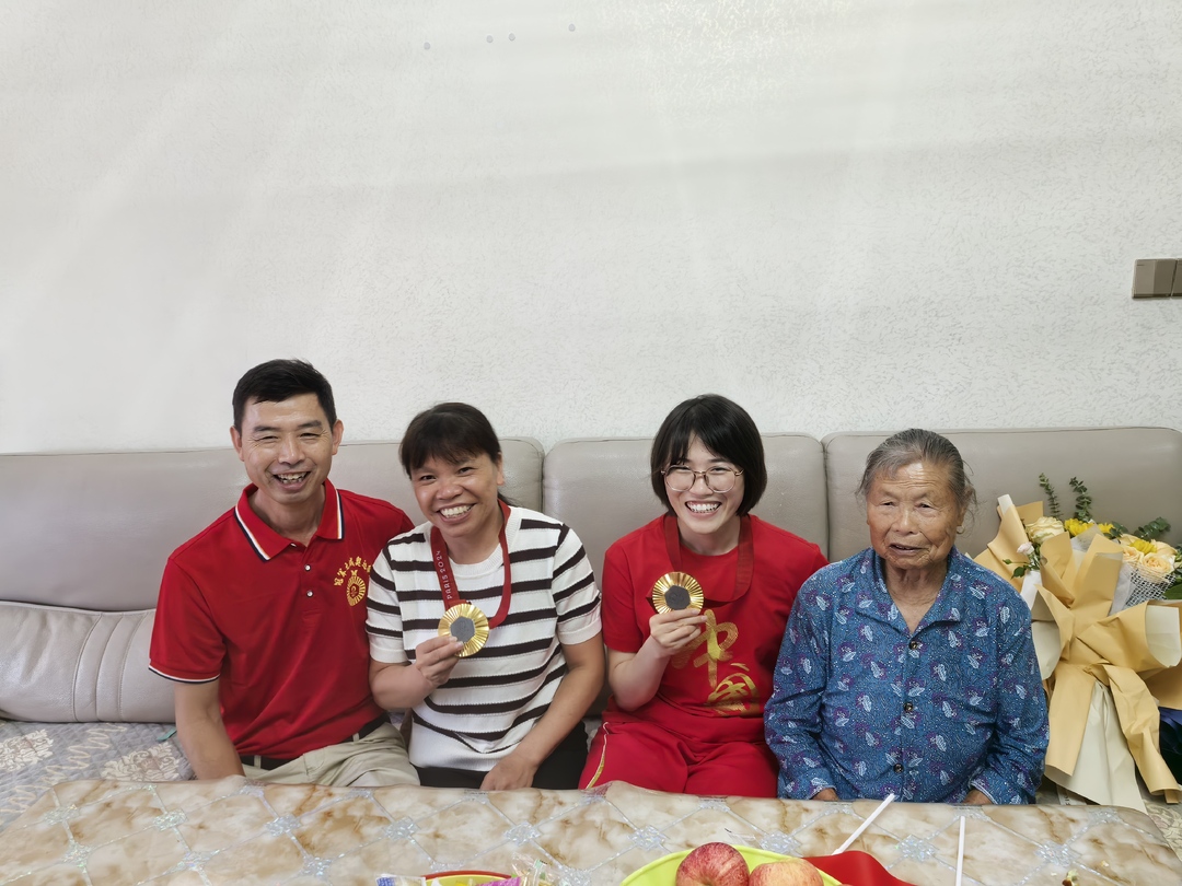 在史逸婷家门前,喜庆的横幅、彩虹充气拱门,街坊邻居、市民群众挥舞国旗夹道欢迎。史逸婷满面笑容向家乡人民问好,一路致谢、一路欢笑。回到家中,史逸婷抱住许久没见的奶奶,祖孙二人难掩激动的泪水。史逸婷高兴地向大家展示了两枚金牌,并将金牌戴在家人胸前,感谢他们默默的支持和付出,一家人其乐融融。