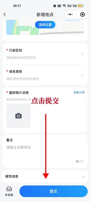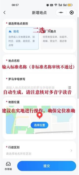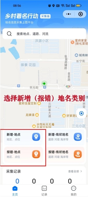 2.选择新增(报错)地名类别点击「新增-地点」、「新增-线状地名」、「报错-地点」、「报错-线状地名」板块即可对地点(地区、点位)、线状地名(道路、河堤、海岸等)进行新增或报错