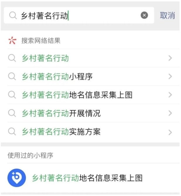 方法2:打开微信→搜索“乡村著名行动”→点击搜索结果→按提示登录(已登录自动跳过)→进入小程序首页。