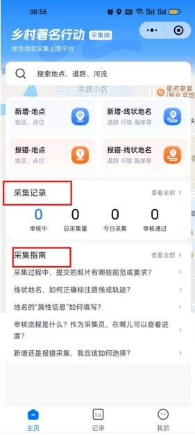 通过「记录」板块可查看采集数量和审核进度。主页下方有“采集指南”,可点击查看相关采集教程;也可点击下方「我的」—帮助中心—常见问题/视频教程,掌握新增地点、新增线状地名、地点报错、线状地名报错的操作流程。