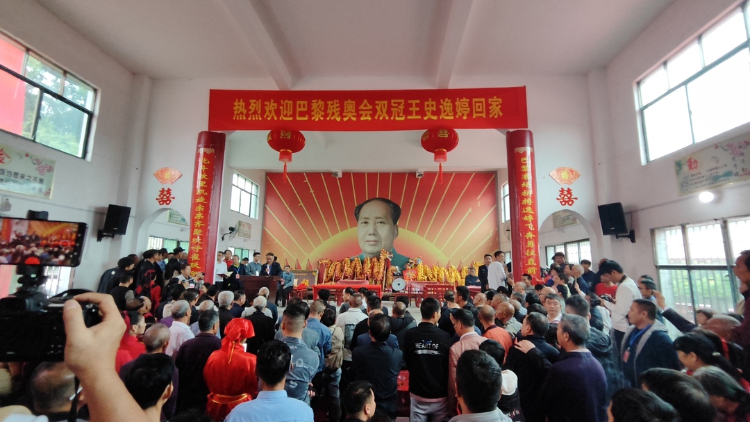 随着史逸婷乘坐的专车来到村口,列队迎接的家乡人民为残奥冠军献上鲜花,村民挥舞红旗,舞龙队伍翻腾跳跃,沿路礼花鞭炮声不断,热闹非凡。在村礼堂,全体村民齐聚一堂欢迎冠军凯旋,向史逸婷表示衷心的祝贺。活动结束后,史逸婷和大家合影,与家乡人民分享荣耀与喜悦。