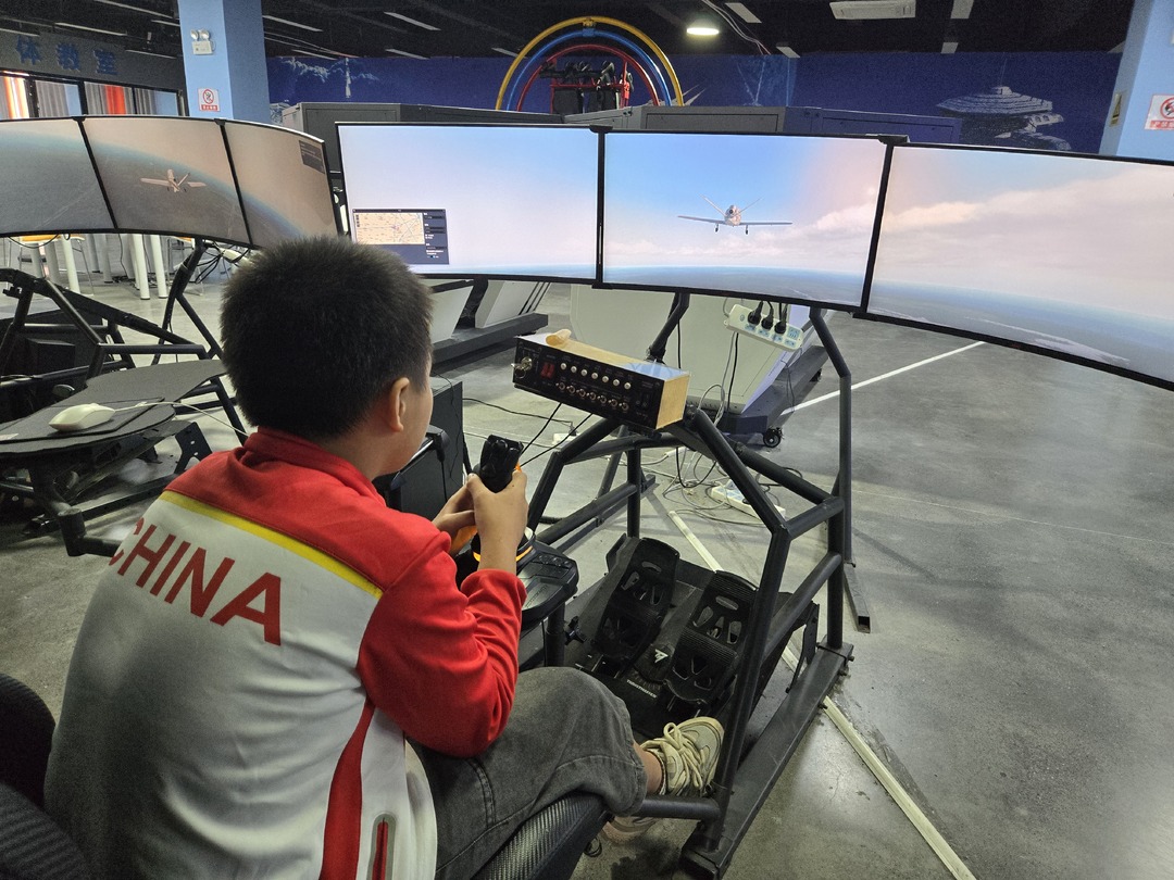 在数字技术体验区,学生们穿戴上VR设备,身临其境体验了一躺“太空之旅”。民兵教官指导大家操作飞机驾驶模拟器,随着数字屏幕上的飞机起降飞行,学生们当上了“中国机长”。本次活动通过亲身参与体验,进一步激发青年学生对科学的热爱和探索未知的热情。