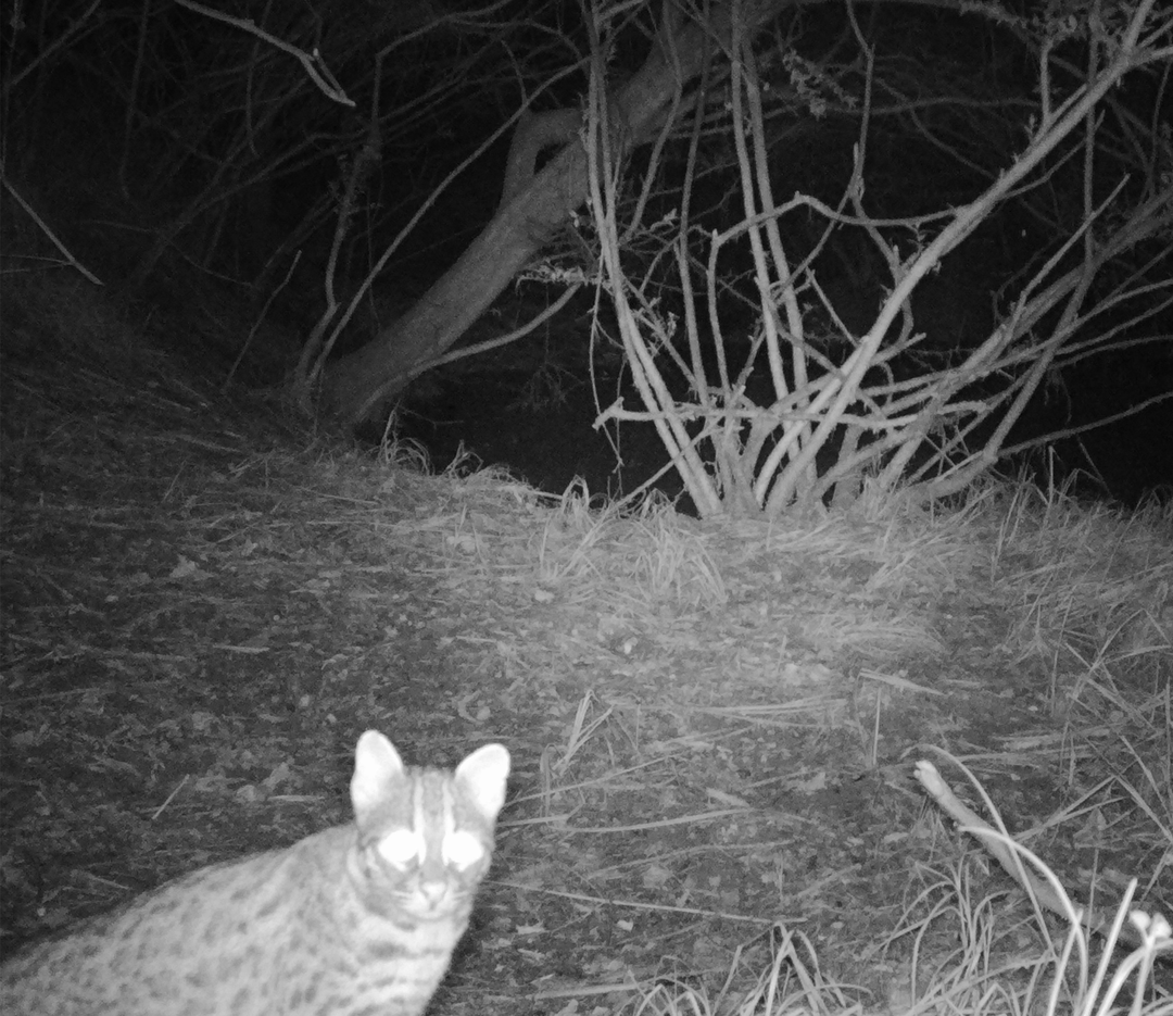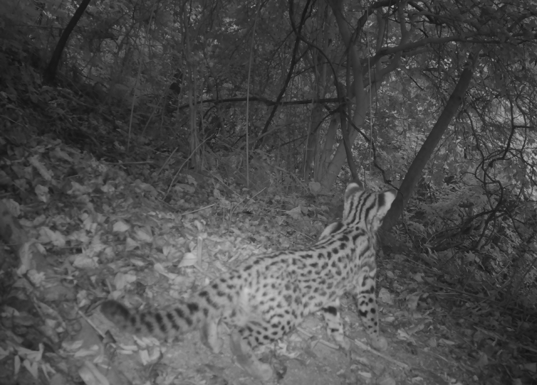 此外,红外相机还纪录到国家二级保护动物——2只豹猫、1只斑林狸夜间觅食的活动影像,从画面上看,两只豹猫全身背面布满不规则黑斑点,身形十分矫健。斑林狸身体修长,头部尖长,四肢细小,一条长长的尾巴非常显眼。豹猫是猫科豹猫属动物,主要栖息于山地林区和郊野灌丛。斑林狸是我国最小的灵猫类,在野外数量非常稀少,两种动物都为夜行性动物。