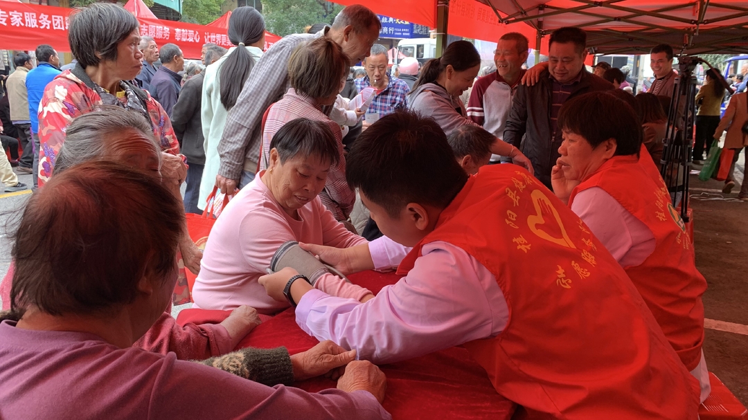 卫生服务台前,医护人员们有条不紊为村民免费测量血压、血糖,进行健康体检。他们认真细致询问大家的身体状况,提供专业健康咨询指导,并宣传常见疾病的预防知识。