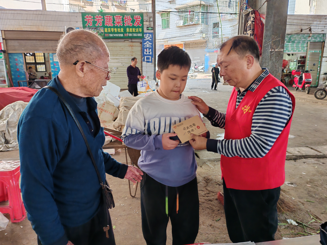 ▲谭宜达志愿者为学生献爱心