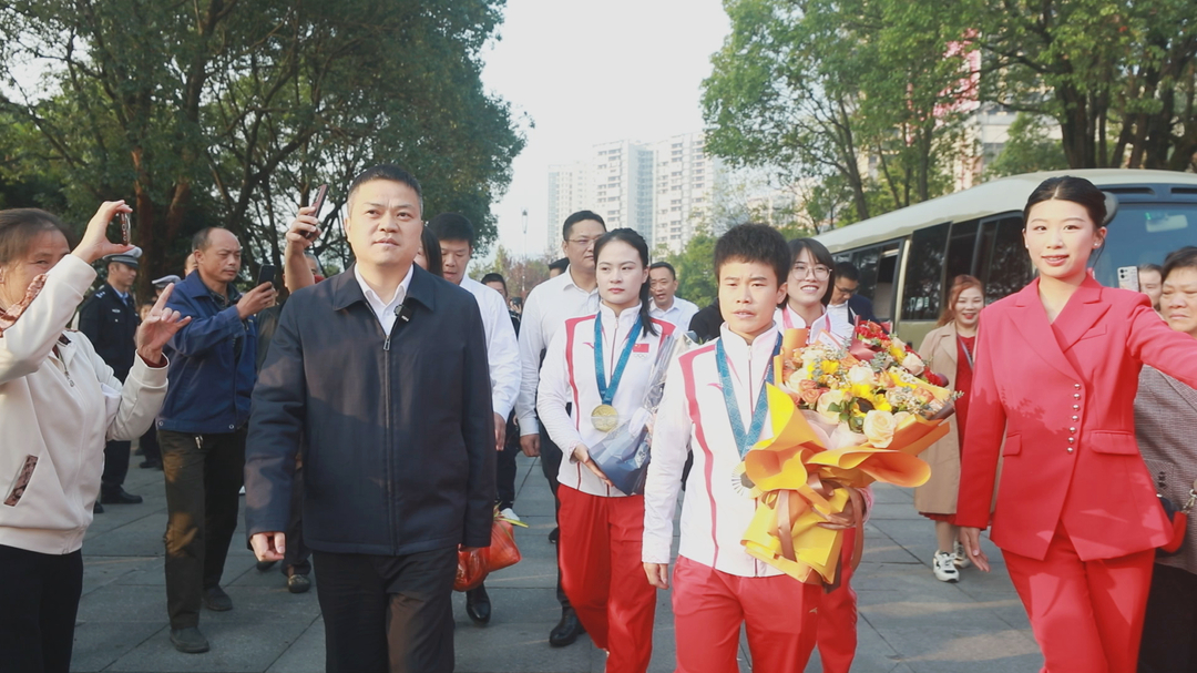 上午7时40分,载有三位奥运冠军的车辆缓缓驶向县行政中心,市民们在道路两旁自发列队前来迎接,他们挥舞红旗,高喊“欢迎冠军回家”。县行政中心前坪广场上,锣鼓喧天,“龙狮齐舞”,家乡人民热情欢迎冠军凯旋。