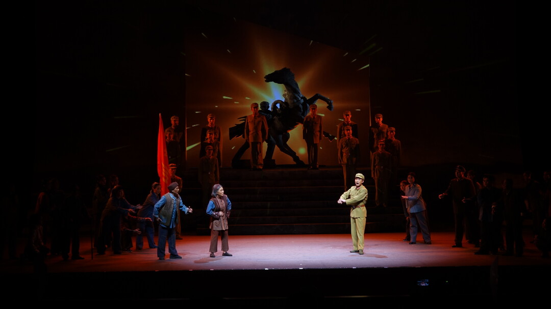 当晚7点30分,演出正式开始。舞台布景精美,灯光音效配合默契,为观众营造了一个身临其境的氛围,将观众带入那个热血年代。饰演欧阳海的演员器宇轩昂,身姿挺拔,举手投足间尽显英雄无畏之姿,群戏场景中,战士们的表演整齐有力,动作划一,彰显出部队的钢铁纪律与昂扬士气;当表演来到欧阳海舍身推马的惊险时刻,舞台灯光突变,音乐急骤。欧阳海冲向惊马的刹那,全场仿若时间静止,演员凭借精湛的肢体语言与极具感染力的神情,将那千钧一发的惊险场景鲜活复现。大家用真挚的情感和扎实的唱功,将欧阳海的形象刻画得入木三分,赢得了观众阵阵掌声。