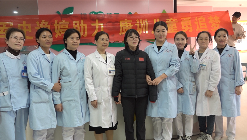 在县第一人民医院儿童康复中心,史逸婷参与了在训儿童小组的感统训练。在县妇幼保健院儿童康复中心,在训儿童欢迎奥运冠军回家并合影,史逸婷分享了成长经历,以多种形式鼓励在训儿童,与大家开展游戏互动。