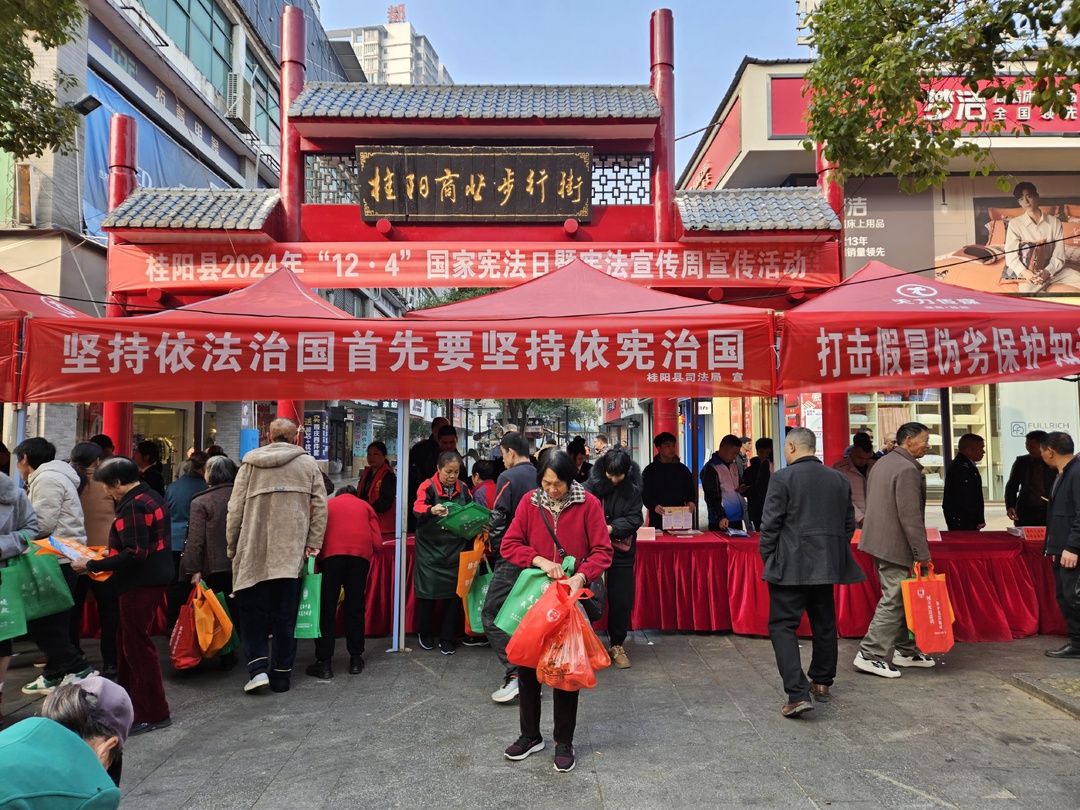 新桂阳12月4日讯(记者 李玮嘉)12月4日是第十一个国家宪法日,今年的主题是“大力弘扬宪法精神,推动进一步全面深化改革”。上午,县司法局联合县城管局、县人武部、县文旅广体局、县公安局、县妇联等十余单位开展国家宪法日暨宪法宣传周集中宣传活动。