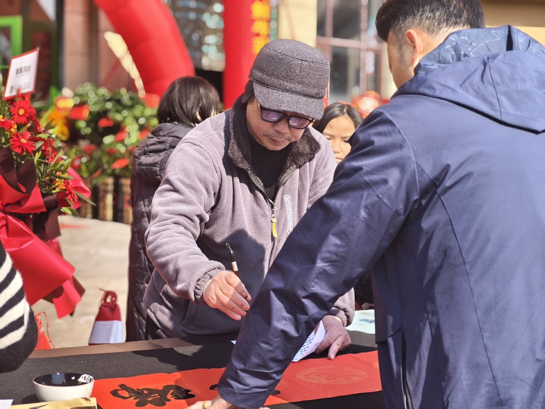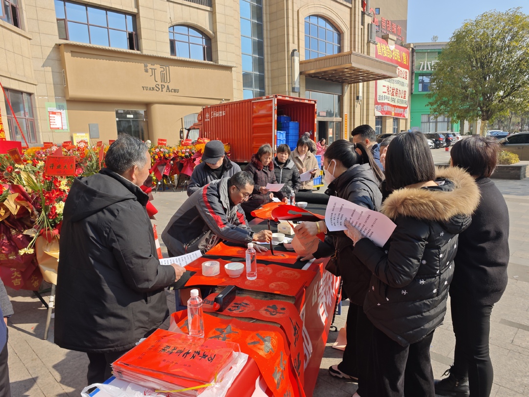 中国工艺美术协会会员、郴州市“德艺双馨”文艺工作者游杰辉等书法爱好者现场挥毫泼墨,笔走游龙之间,一幅幅带着美好祝福的春联跃然纸上。志愿者把春联免费赠送给市民,为大家送去新春的祝福,活动共赠送春联200余副。