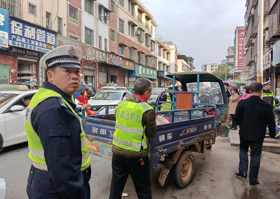 桂阳县樟市干部职工联合樟市交警四中队在樟市圩疏导交通、帮助群众把路边抛锚的三轮车推到指定停车位置