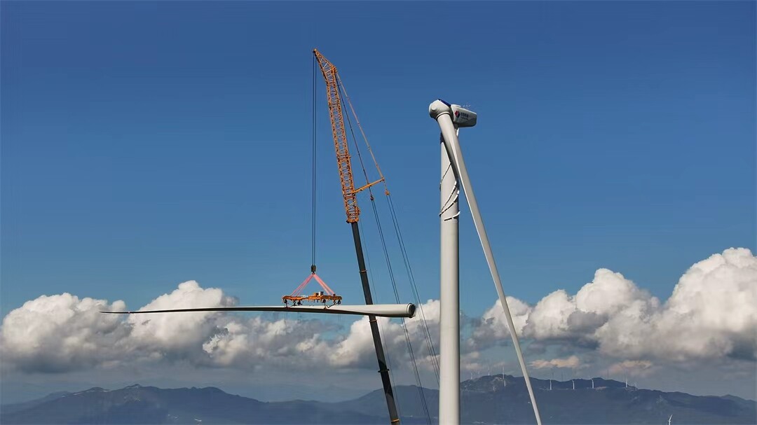 欧阳海风电场二期项目是中电建新能源集团在桂阳投资的第十个风电项目,位于泗洲山,海拔高度在790—1290米之间。项目计划总投资3亿元,设计安装10台单机容量为5兆瓦的风力发电机组,总装机规模为50兆瓦。为确保风机吊装工作顺利开展,项目部加强天气及风力监控,精准抢抓施工窗口期进行施工。