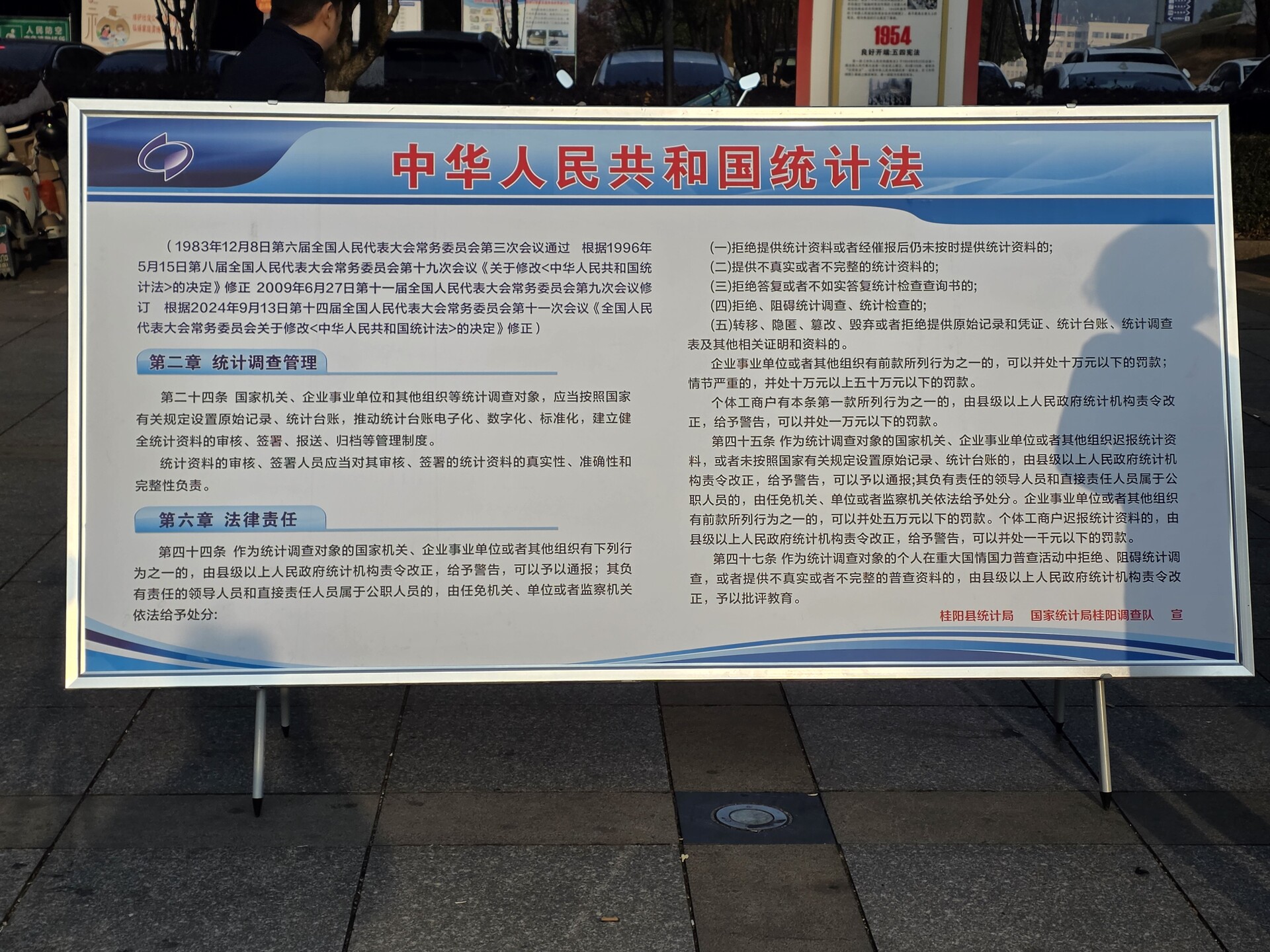 新桂阳12月9日讯(记者 李玮嘉)为切实提升全社会统计法治意识,优化统计法治环境,深入学习宣传贯彻新修改《中华人民共和国统计法》与《湖南省统计管理条例》,12月8日,县统计局在冠军公园开展统计法颁布42周年纪念宣传活动。