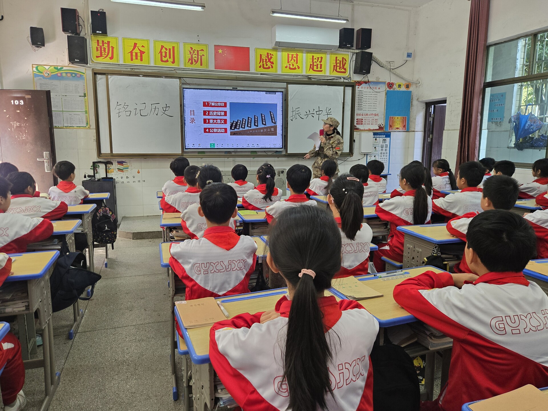 诵读活动结束后,民兵们走进教室开展南京大屠杀历史讲座,通过展示真实的图片、视频等历史资料,让师生们了解南京大屠杀的惨痛历史。师生们还共同诵读了《和平宣言》,饱含对遇难同胞的深切哀悼,传递出对和平的向往与珍视。