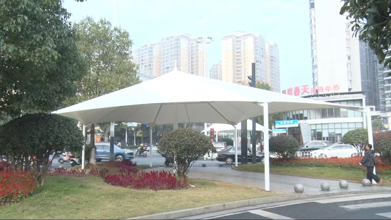 据了解,该交叉路口作为城区交通要道,行人与非机动车流量较大,过往群众等候红绿灯时常面临日晒雨淋的困扰。县市政公用设施维护服务中心聚焦市民出行“小需求”,将遮阳棚建设纳入民生实事,经过实地勘查、方案优化后,在路口四个渠化岛同步推进建设。新建遮阳棚采用钢管骨架与高韧度PVDF张拉膜结构,兼具抗紫外线、防雨耐候等特性,棚体设计贴合路口地形,既不影响车辆通行视线,又能实现等候区域全覆盖。