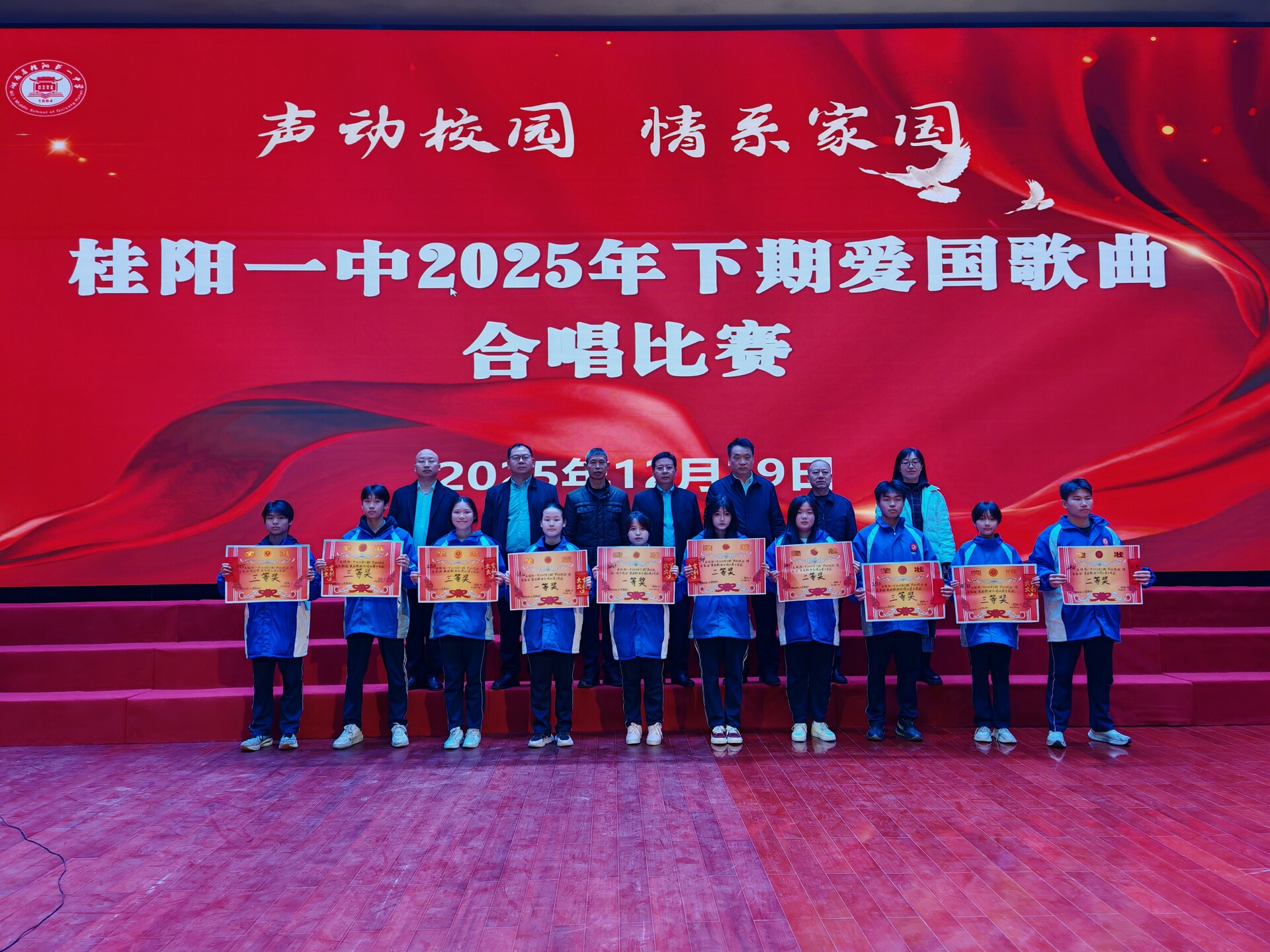 新桂阳12月30日讯(记者 周立志)12月29日,桂阳一中开展“声动校园 情系家园”2025年下期爱国歌曲合唱比赛。