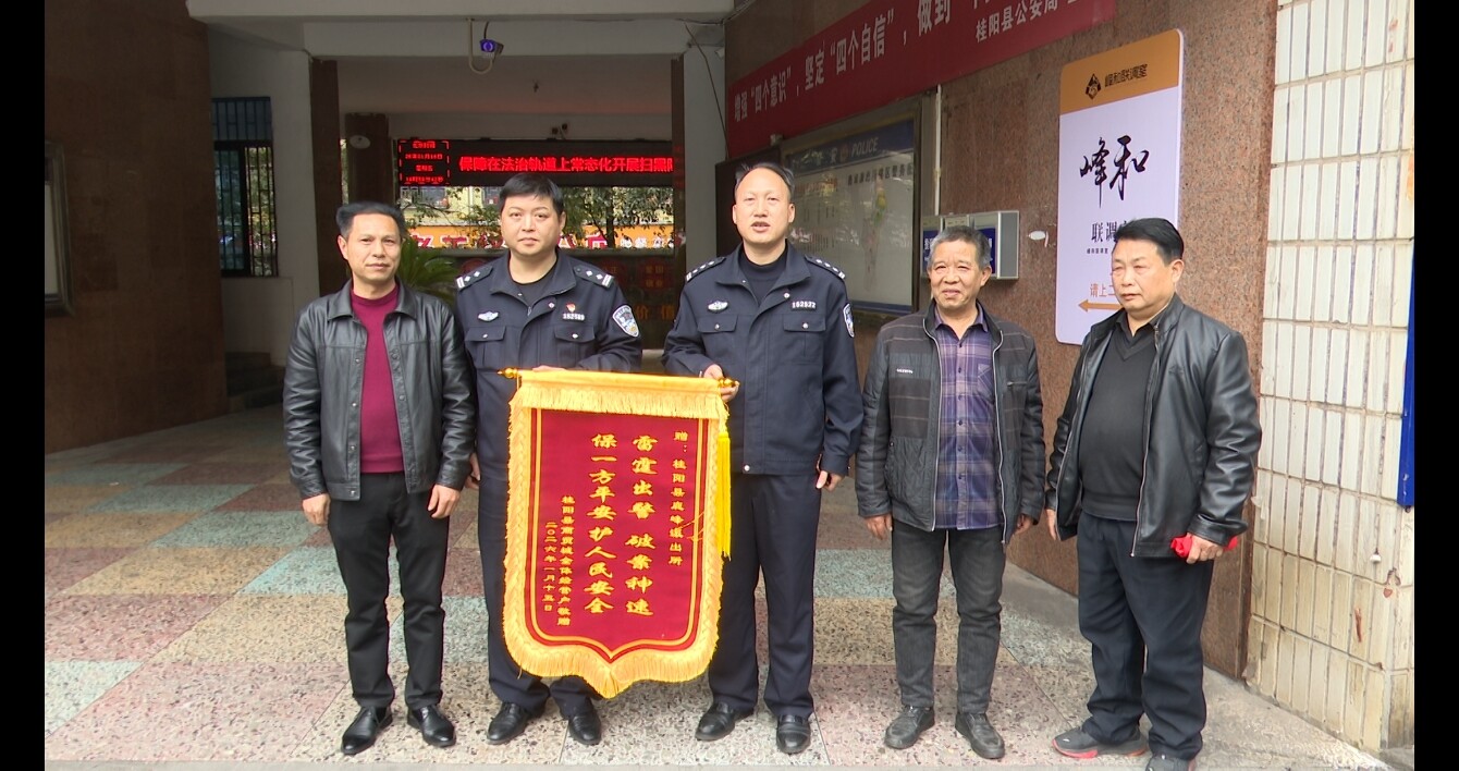 新桂阳1月19日讯(记者 李玮嘉 刘克坚)1月16日,桂阳商贸城全体经营户代表,将一面印着“雷霆出警 破案神速 保一方平安 护人民安全”的锦旗送到县公安局鹿峰派出所,感谢民警快速破获系列盗窃案。