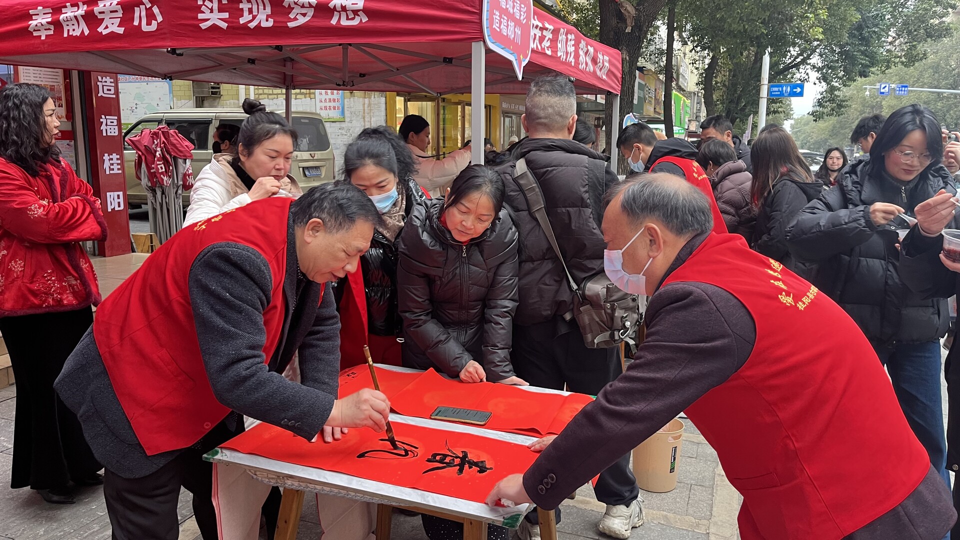 除了暖心暖胃的腊八粥,书法志愿者们还挥毫泼墨,一幅幅笔力遒劲的春联、一张张寓意吉祥的“福”字,在笔墨挥洒间传递着浓浓的年味与祝福。市民们一边品尝腊八粥,一边挑选心仪的春联,传统节日的仪式感与幸福感在欢声笑语中不断升温。