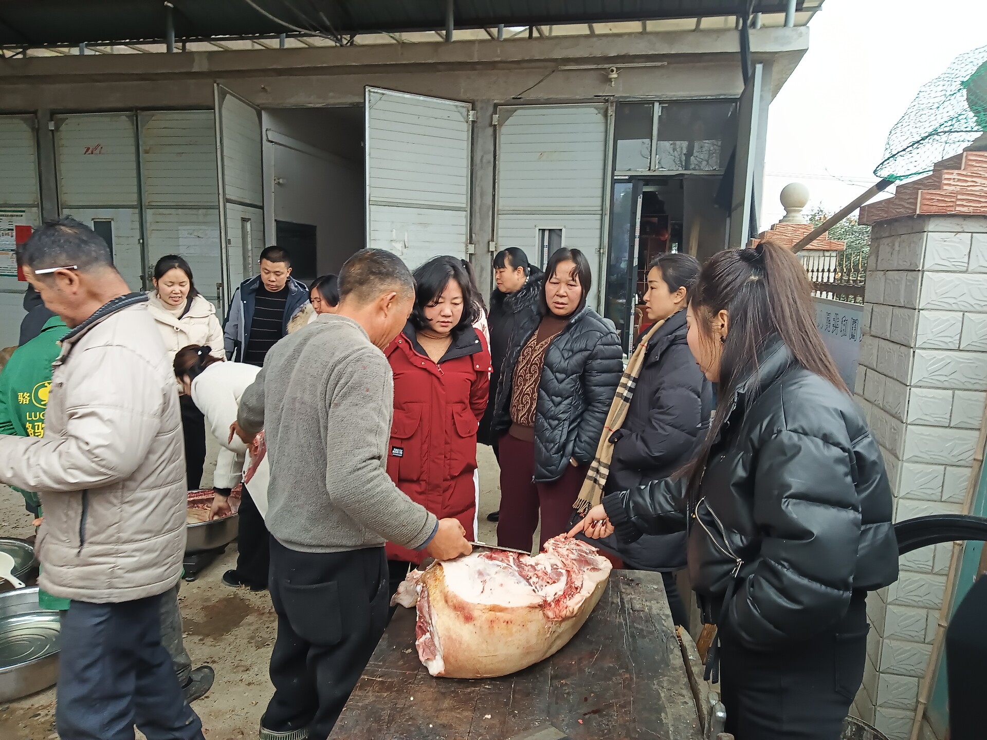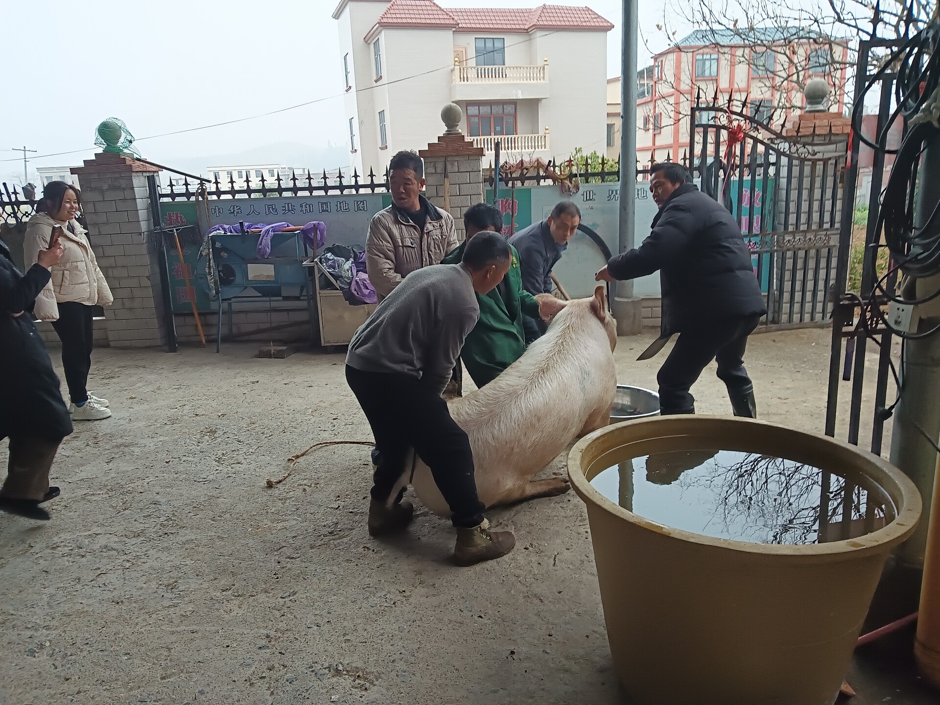 腊月的晨光铺开,流峰镇东塔村二组的村民将一头近300斤的肥猪赶出圈栏,随后,众人合力按住这头肥猪,主刀师傅手起刀落,动作干净利索。