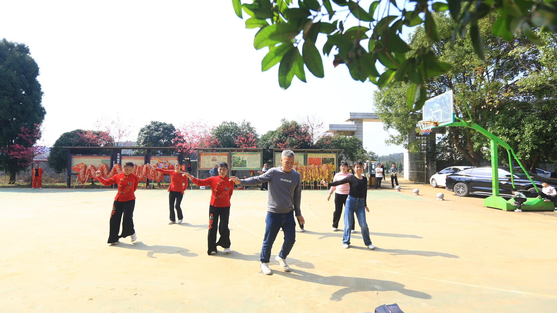 广场舞队伍身着盛装翩翩起舞,展现村民健康向上的精神风貌;篮球赛场,队员们奋力拼搏,加油声此起彼伏,处处洋溢着喜庆祥和、团结向上的新春氛围。