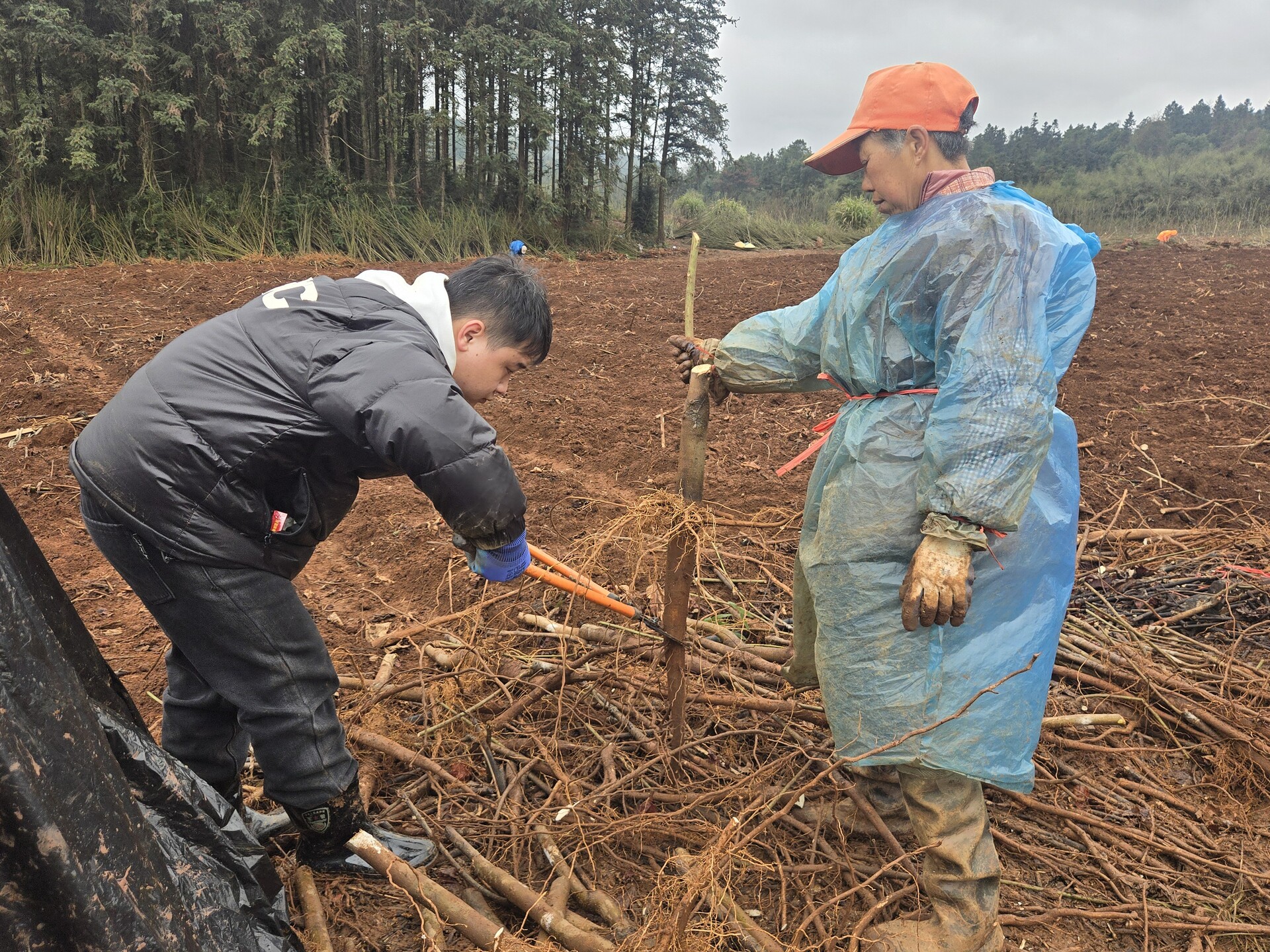 早春气候温暖湿润,在和镇和谐村油桐示范基地,村民们将精心培育的油桐苗从土壤中挖出,根据后续移栽需求,开展选苗、切根、泥浆蘸根等准备工作。