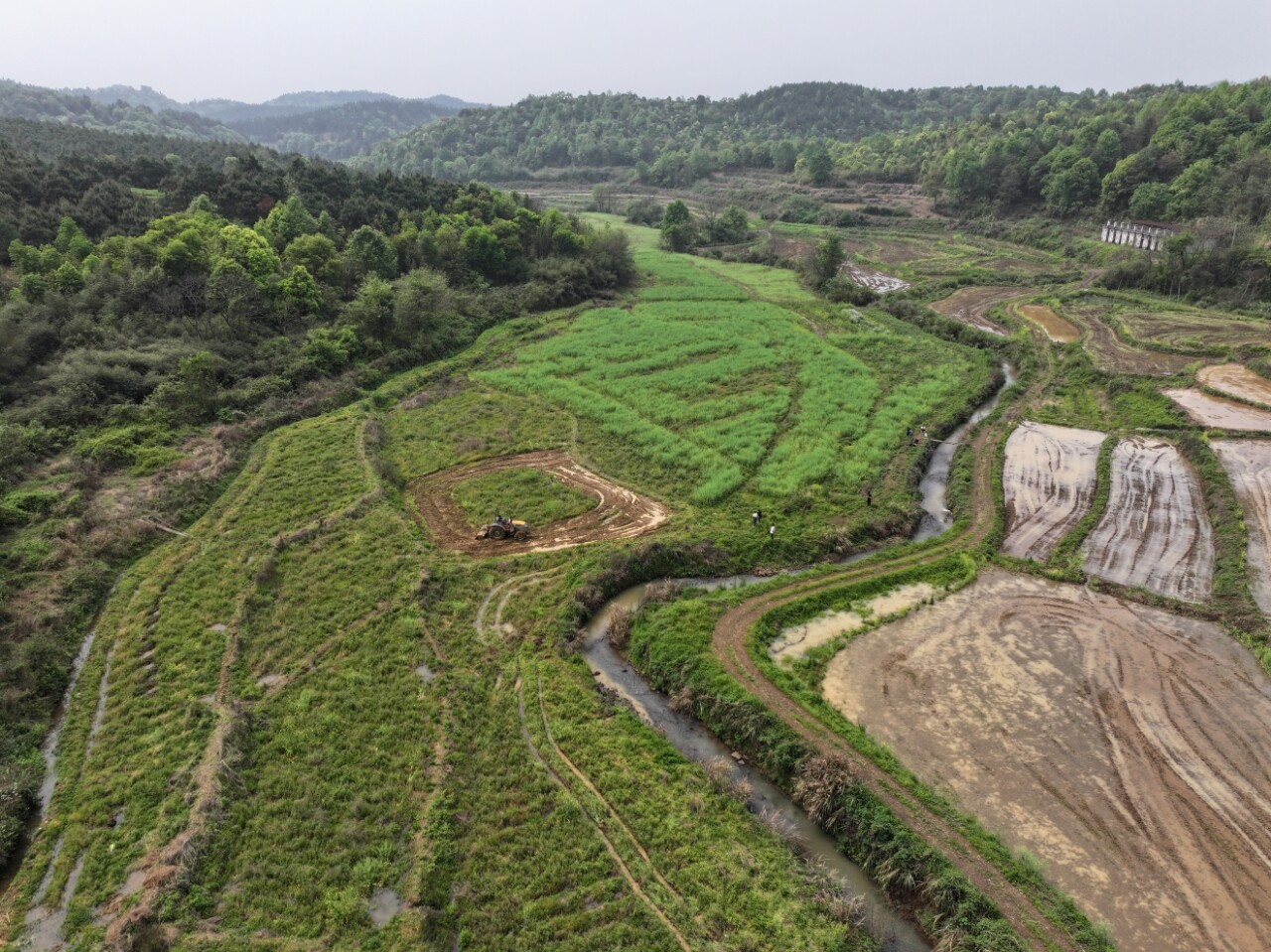 在舂陵江镇桥溪村水稻生态种植基地,180余亩连片农田里的紫云英、油菜花迎春盛开,随风摇曳。稻田里机声隆隆,旋耕机来回穿梭作业,将长势旺盛的紫云英翻压入土,原本板结的田块逐渐变得平整松软,为即将开展的早稻插秧工作做好充分准备。