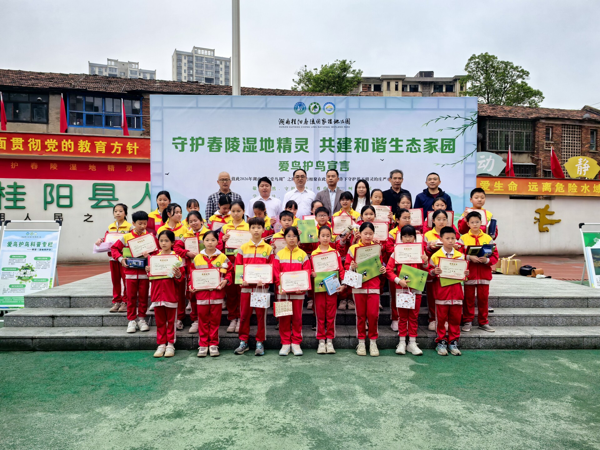 此次活动以“守护舂陵湿地精灵,共建和谐生态家园”为主题。启动仪式上,全体人员宣读“爱鸟护鸟宣言”,坚定守护生态的决心;宣读表彰了“爱鸟周”主题作文征文获奖者。随后组织学生参观“湿地移动课堂”识鸟、爱鸟、护鸟科普图片展览,了解鸟类知识与湿地生态保护的重要性。