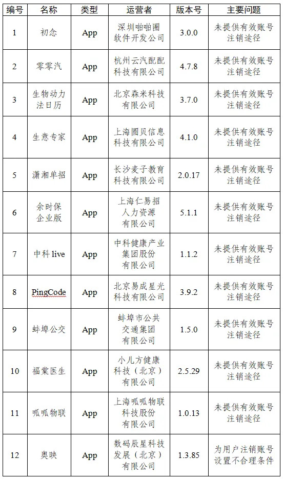 四、初念、零零汽等12款App未提供有效账号注销途径或为用户注销账号设置不合理条件(详见下表)。