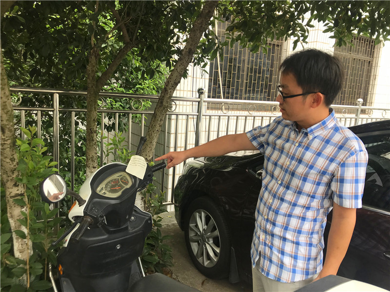 9月21日晚,桂阳三中教师何忠文下班后前往学生宿舍查寝,发现自己停靠在校内桂花树下的摩托车右边后视镜被打碎,地上还残留了一些玻璃碎片,车头也有许些倾斜。