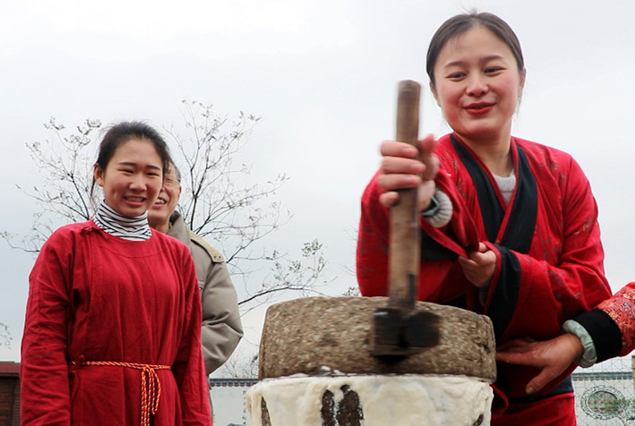 活动现场的磨豆腐,与抖糍粑不同,不需要耗费很大体力,吸引着更多女性参与。不少男士也图个新鲜,在现场跃跃欲试,完了还不忘发个朋友圈,与亲朋好友分享着磨豆腐的喜悦。