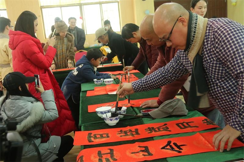 郴州九三学社书法家现场挥毫,为当地群众写春联,送祝福,吸引着不少社员、群众参与其中,这些个性春联也深受当地群众欢迎,不少人都希望能领回一幅春联,迎接来年的好运。