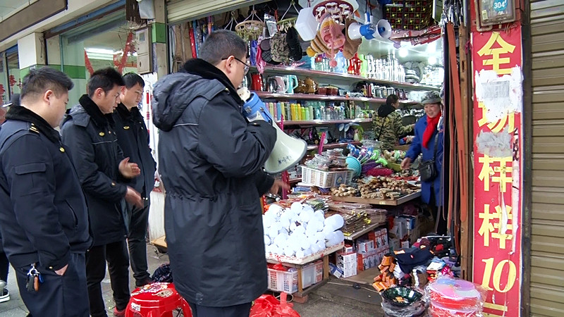 综合整治行动中,执法人员对人流较多的地段进行了全方位巡察,对跨门店经营、流动摊贩违章占道经营等违章行为进行劝阻。