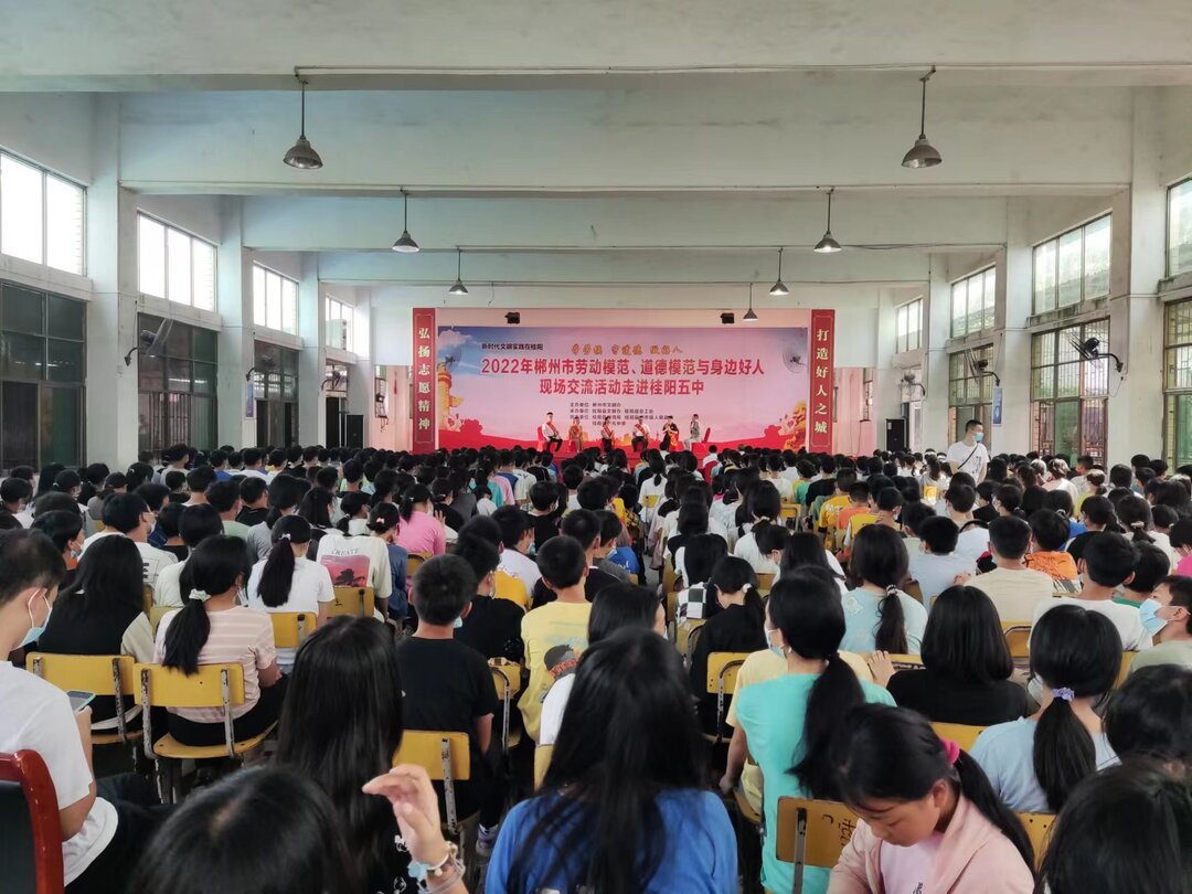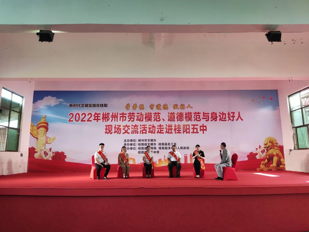 新桂阳6月13日讯(记者 刘娣)6月10日,由市文明办主办,县文明办、县总工会承办的2022年郴州市劳动模范、道德模范与身边好人现场交流活动走进桂阳五中。