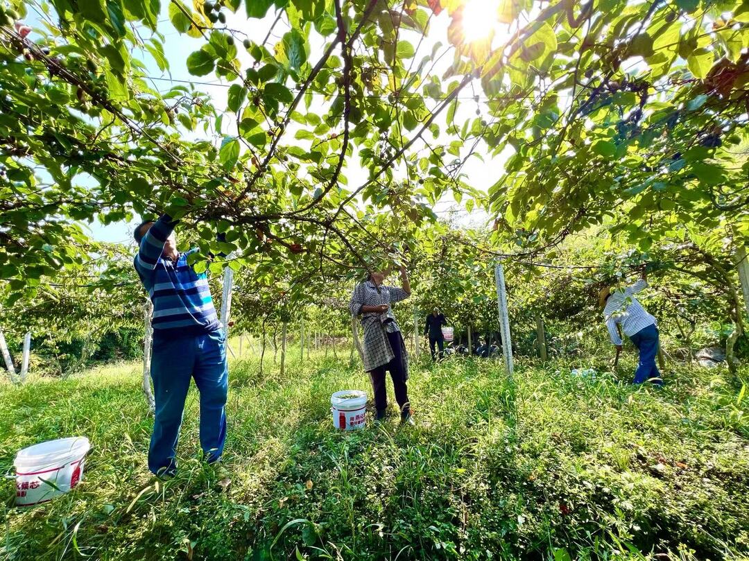 走进荷叶镇高山村的农场里,猕猴桃枝蔓郁郁葱葱、紧紧相连,一颗颗沉甸甸的果实挂满枝头、相互簇拥,“迷你”版软枣猕猴桃散发着清甜的果香,让人“垂涎欲滴”,好一派丰收的景象。农户们正在棚架底弯腰穿梭,采摘成熟的猕猴桃。