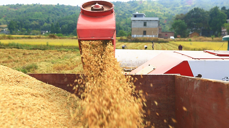 在雷坪镇,片片金黄的优质稻田里,稻穗缀满枝杆,收割车来回忙碌不停,颗颗圆润饱满的谷粒让丰收的喜悦装满车。