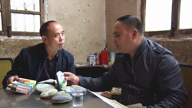 技艺生疏就上网自学,缺乏材料就采用家中的书本封面或河里的石头等…两年来,王造义陆陆续续创作了几十幅农村风光或人物画, 作品受到了身边亲戚朋友的喜爱和专业人士的肯定。