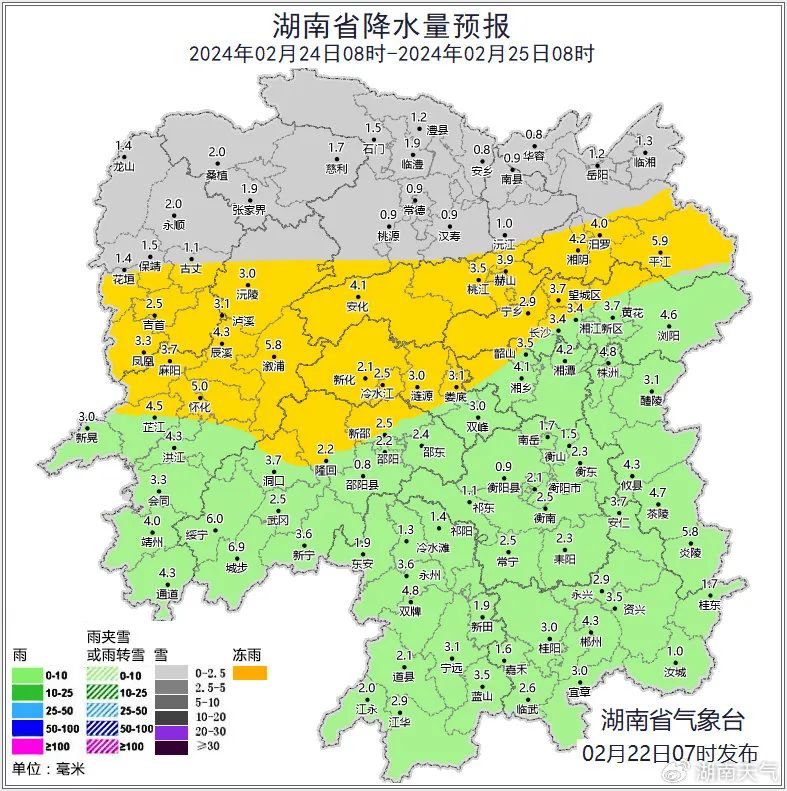 湖南省2月23日08时至24日08时累计降雪(雨)量预报图