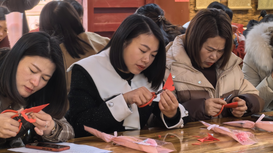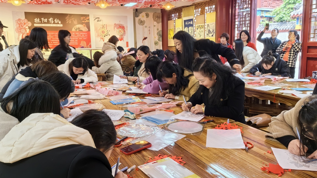 在县文化园研学基地,全体人员参观美术馆、造纸馆、奇石馆、木雕馆等,深入了解非物质文化遗产的魅力。在剪纸馆,郴州市非遗剪纸传承人黎艳青为大家讲解剪纸的基本知识和技法,指导制作剪纸团扇,让大家亲身感受传统艺术的魅力。