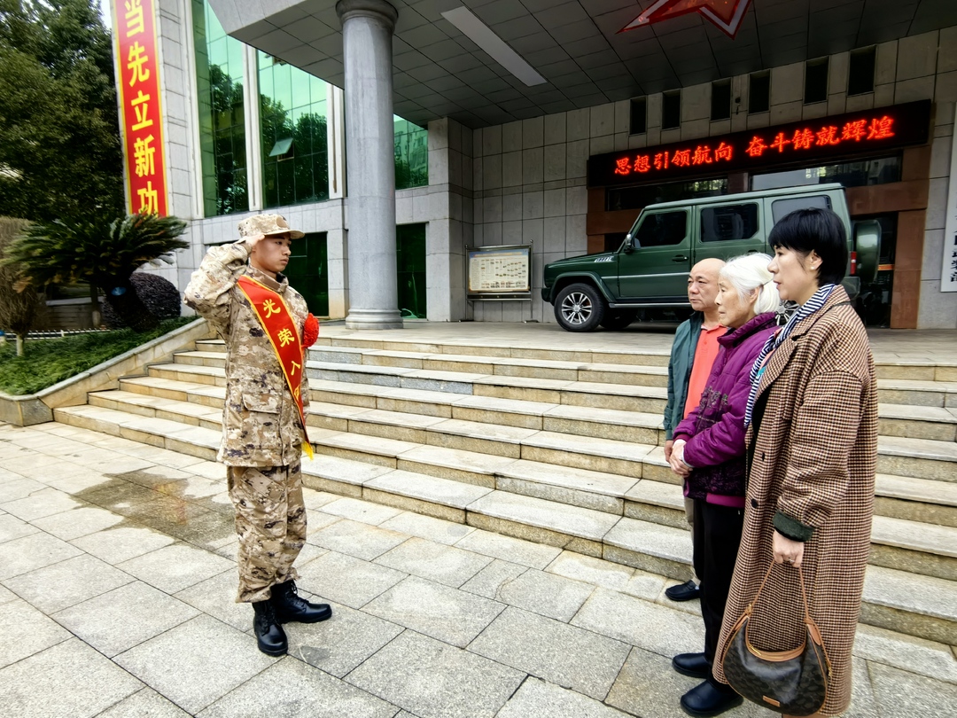 在县人民武装部,新兵身穿戎装,胸佩红花,整装待发。队列中有一位身姿挺拔、神采奕奕的大男孩,略显稚嫩的脸上写满坚定,他就是杜俊卿。启程从军路,依依话别时。杜俊卿的奶奶、姑姑等亲人早早来到这里,见证这光荣时刻,眼中难掩自豪和喜悦,却又十分不舍。一家人拍下了临行前的一张全家福,临别时,奶奶紧紧拉着他的手,口中不停念叨着关切的话语。杜俊卿满怀惜别之情,标致地向亲人敬了人生第一个军礼,带着亲人的叮咛嘱托和家乡各界的殷切希望,迈着坚定的步伐奔赴军营。