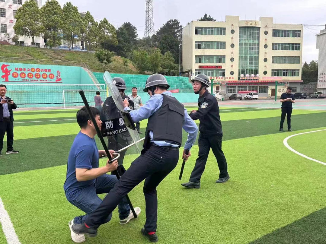 讲座结束后,工作人员带领学校老师、保卫人员进行反恐防暴应急演练,现场演示盾牌、钢叉、防暴棍等常用防卫器械的正确使用方法。演练现场,模拟一名“歹徒”持刀翻墙闯入校园,企图袭击师生,学校应急人员立即启动应急预案,第一时间处置,借助防卫器械,默契配合,果断处置,成功将歹徒制服,并带离现场。