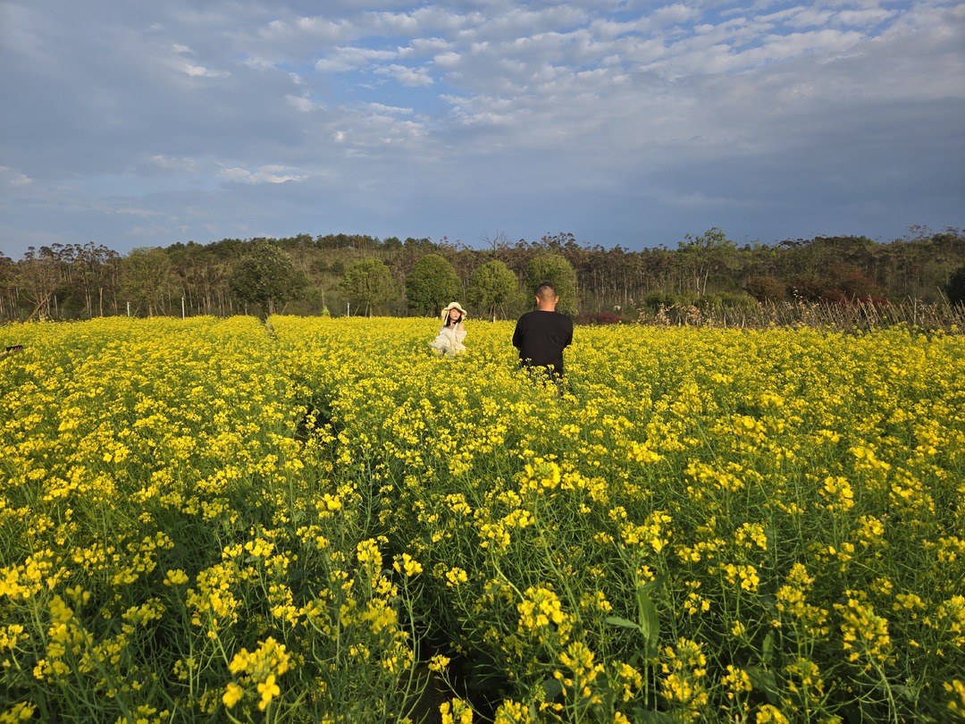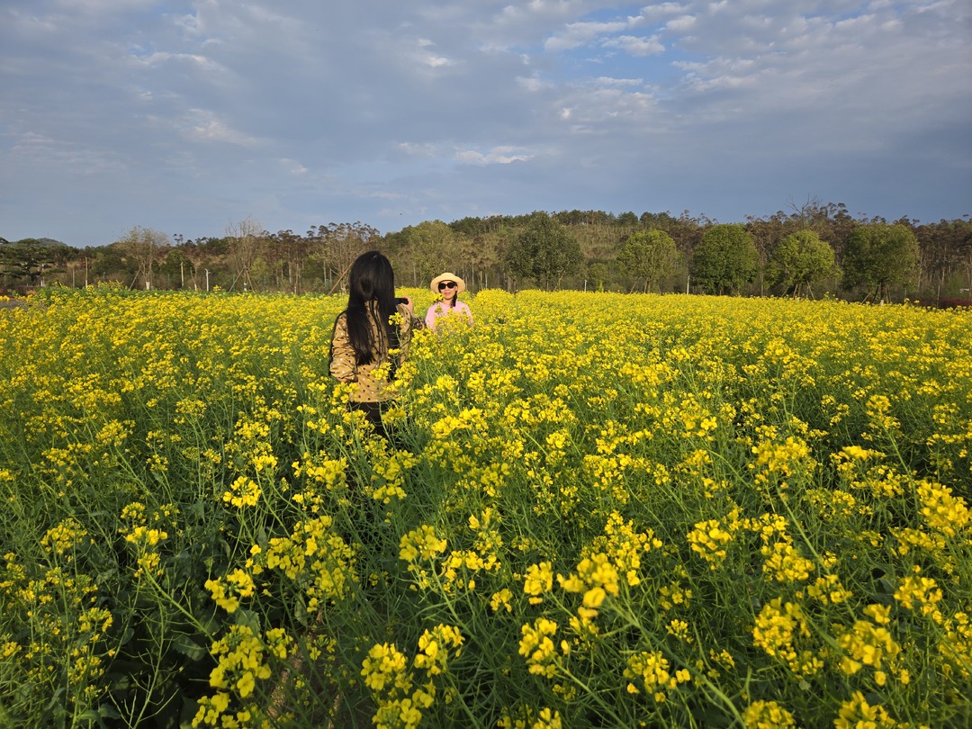 俯瞰山脚,成片的油菜花海与万里晴空相映成趣,游客们纷纷走进花田驻足观赏,与春日风光亲密交流,捕捉每一抹春的风采,成就这幅春日画卷里的生动风景。